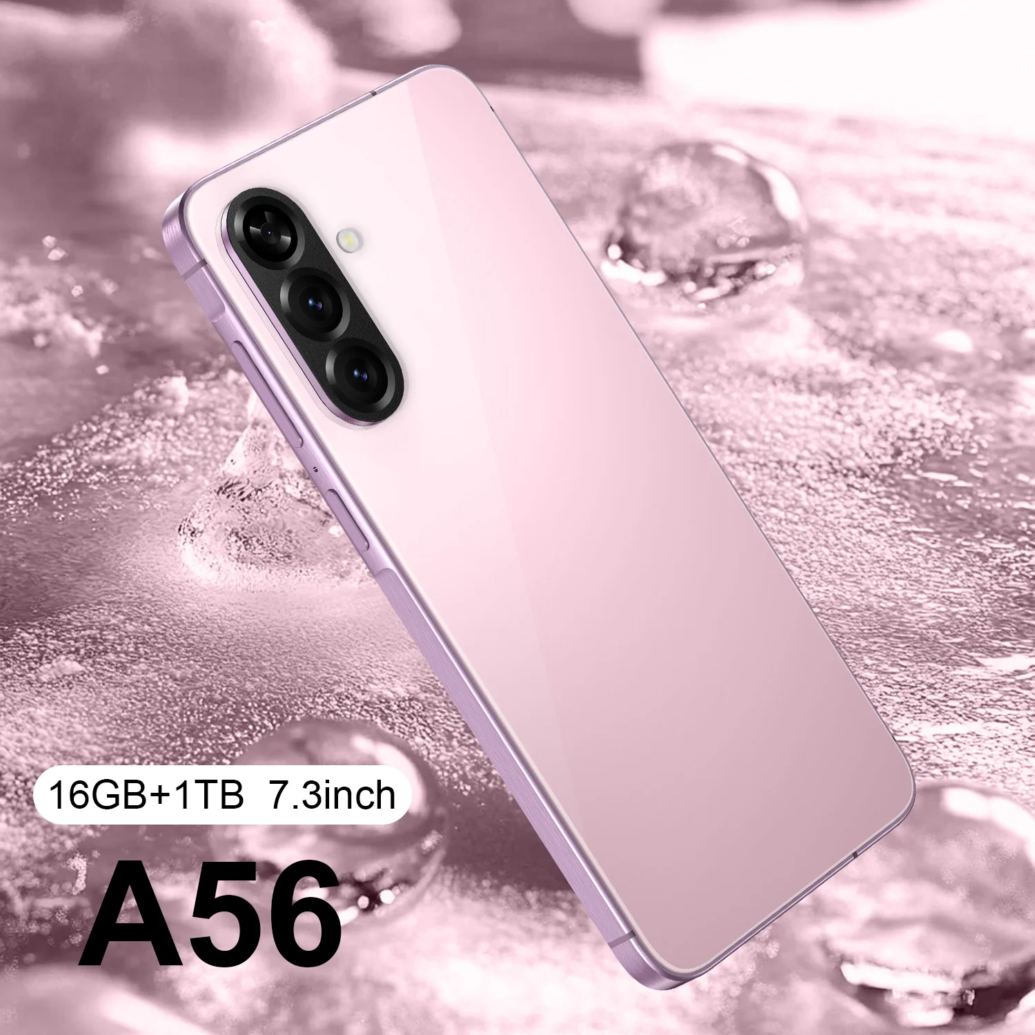PRODUCT NAME A56 CHIP Snapdragon8Gen3 SCREEN SIZE 7.3inch RESOLUTION RATIO 3040*1440 COLOR Black, Military,Green,TitaniumGold,Yellow,Purple, Pink, Orange, White ,Green RAM 16GB ROM 512GB OPERATION SYSTEM Android 14 FRONT-FACING CAMERA 72MP REAR CAMERA 108MP BATTERY CAPACITY 8000mAh SET Mobile phone + packaging box + manual + charger +USB cable + headset + mobile phoneprotective film+ protective case WEIGHT 500g