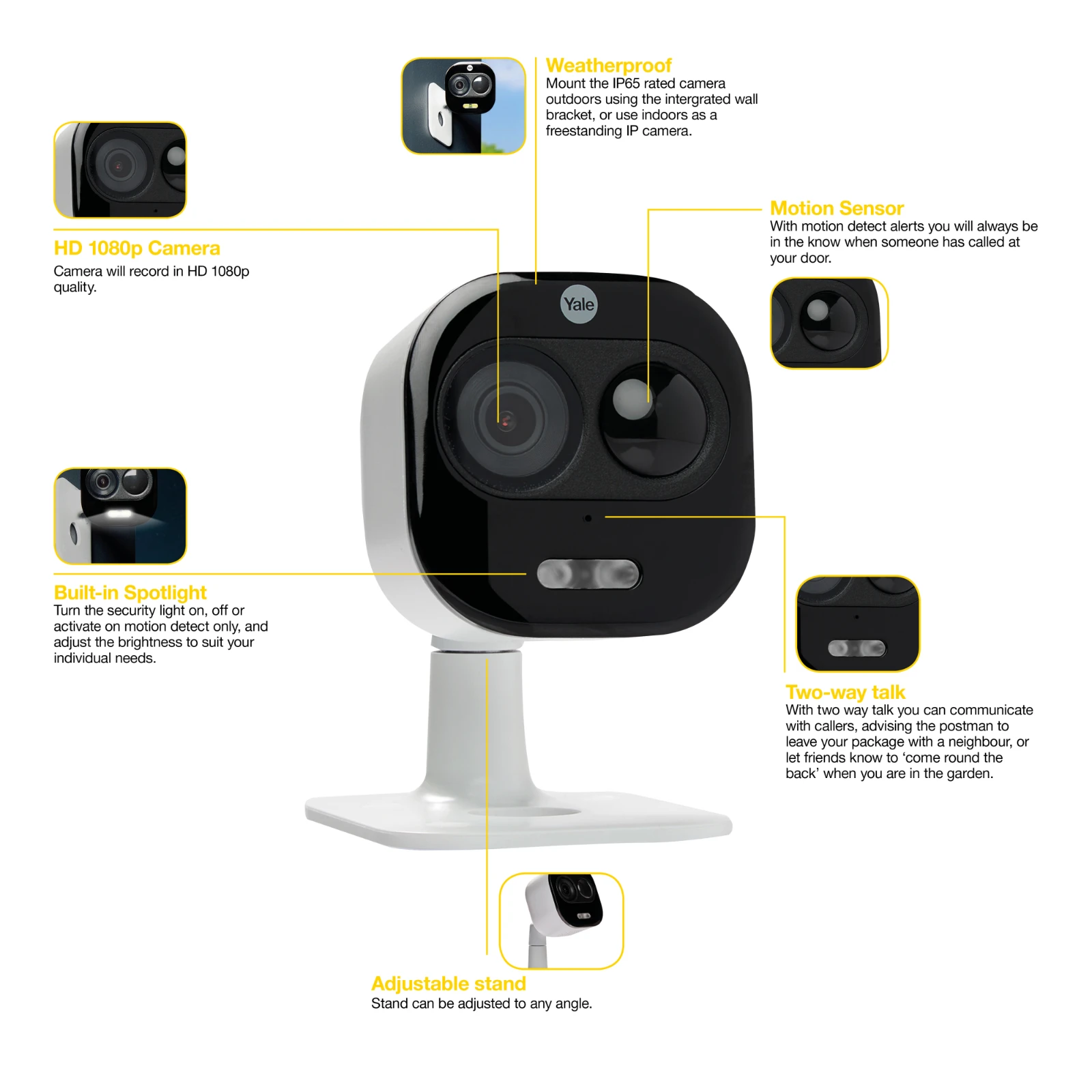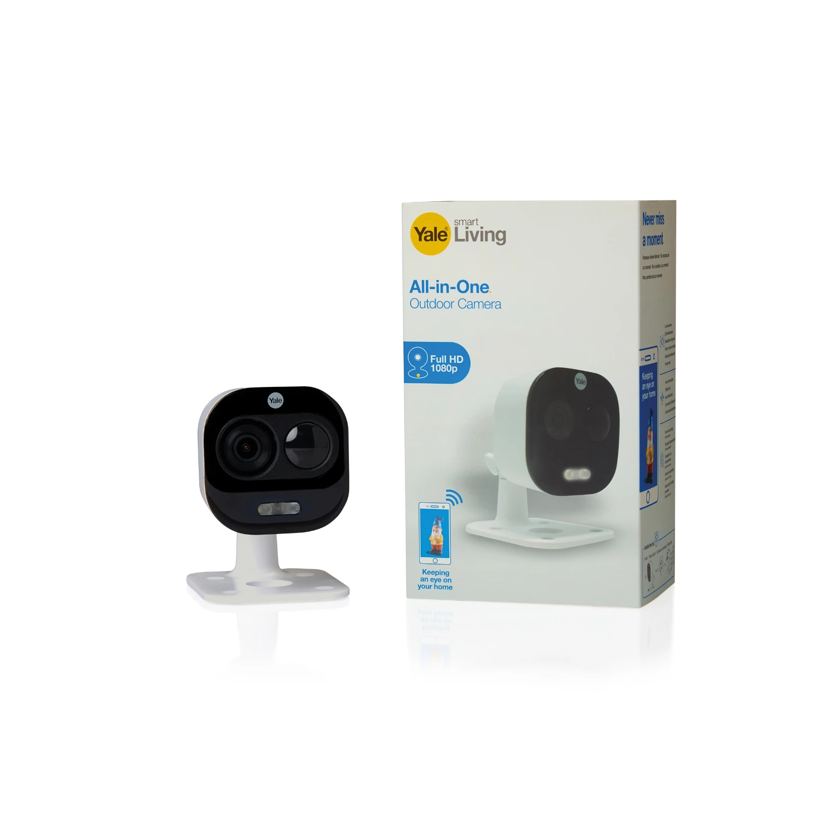 The All-in-One Camera keeps your home secure, wherever you are. Receive instant alerts of what’s going on at home, even when you’re away.With live-viewing, real-time two-way audio, motion detection and a built-in spotlight, all accessible through the Yale View app – it’s everything you need to keep track of postal deliveries, friends visiting or the dog walker arriving at home. · · · Live Viewing: Live streaming anywhere – You can find out exactly what’s happening at home when you’re away , with instant app alerts · · Spotlight: Turn the security light on, off or activate on motion detect only, and adjust the brightness to suit your individual needs. · · Motion Detection Notifications: You will always be in the know when someone has called at your door · · In App Control: Set up and control your All-in-One camera via the Yale View app. · · Real-time conversation: With two way talk you can communicate with callers · · Image masking: Ensure you only get alerted when a visitor enters a specific area in front of your camera. · · Siren alarm: The in-built siren is ideal for getting rid of unwanted visitors and suspicious characters and can be activated within the Yale View app putting you in full control. · · Weatherproof: Mount the IP65 rated camera outdoors using the intergrated wall bracket, or use indoors as a freestanding IP camera. · · Features 10M night vision for clear images both day and night. · · View your camera feed on Alexa screen enabled devices.