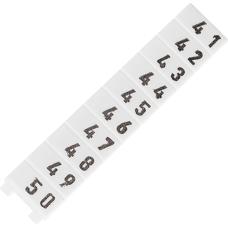 · · Marked with: 41-50 · · 10 tags per strip · · Modular spacing: 6mm · · colour white · · 6mm wide · · for clear wire/termination point assignment · · black figure on white background