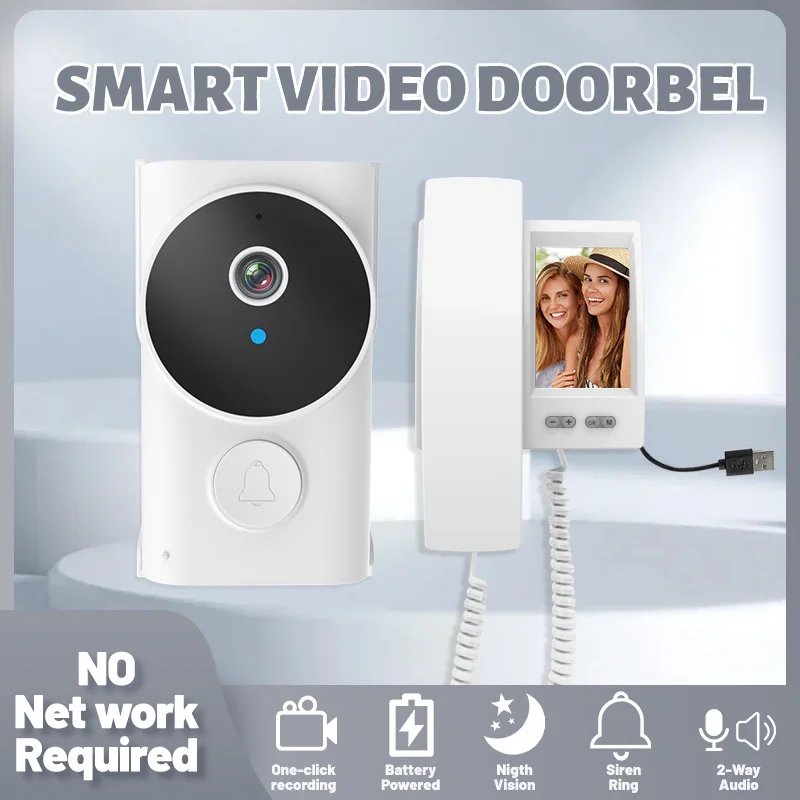 Wireless Video Doorbell Camera WiFi HD 4.3″ Display Real-Time Indoor Monitoring Enhanced Night Vision Two-Way Audio Long Battery Feature: No WIFI video doorbell, information is more secure Wireless installation, one-click pairing, more convenient installation 4.3 inch IPS screen, full viewing Angle display, clearly visible 2.4G private protocol, long transmission distance, more powerful signal Video two-way intercom Doorbell ultra-low power consumption, long standby. Indoor pilot plug-in mode, quick response The system automatically stores photos and inserts the card automatically for recording Infrared night vision Multilingual support Indoor unit six Ding-dong music switch Real goods: Advertising pictures