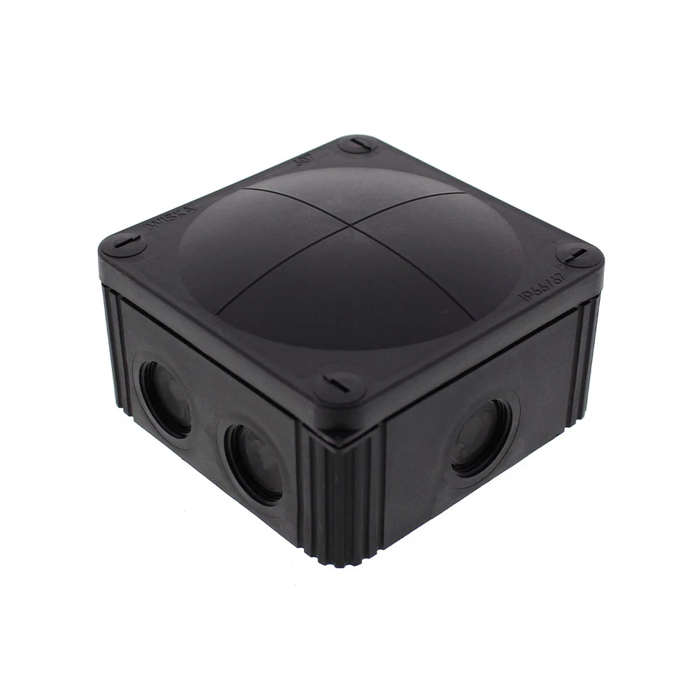 Combi 10-Inlet Junction Box 6mm² 110 x 110 x 66mm Black · · · Suitable for extreme condition or outdoor installation · · Weather-proof · · Resistant to ultraviolet · · Shatter proof · · Impact-resistant · · Flame-retardant · · Halogen-free · · Self-sealing membrane enables · · Captive and rust-free quick-release lid screws of plastic