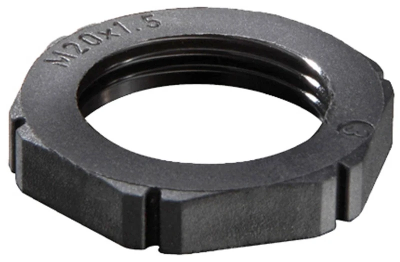 Black Plastic locknut M12 For secure fastening of cable glands and cable gland accessories. · · · Plastic Locknut · · Locknut for cable gland · · Locknut for cable screw gland · · Locknuts with collar polyamide · · RoHS compliant · · RAL 9005 · · Polyamide, fibre reinforced · · Temp Range -40 °C – 100 °C · · Halogen free · · Suitable for 12mm cable glands