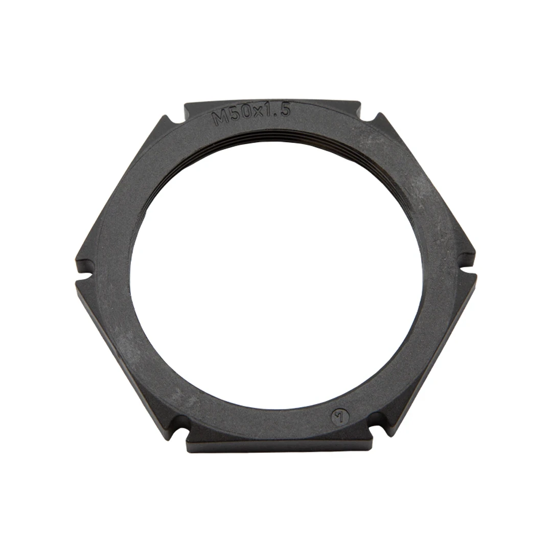 Black Plastic locknut M50 For secure fastening of cable glands and cable gland accessories. · · · Plastic Locknut · · Locknut for cable gland · · Locknut for cable screw gland · · Locknuts with collar polyamide · · RoHS compliant · · RAL 9005 · · Polyamide, fibre reinforced · · Temp Range -40 °C – 100 °C · · Halogen free · · Suitable for 50mm cable glands