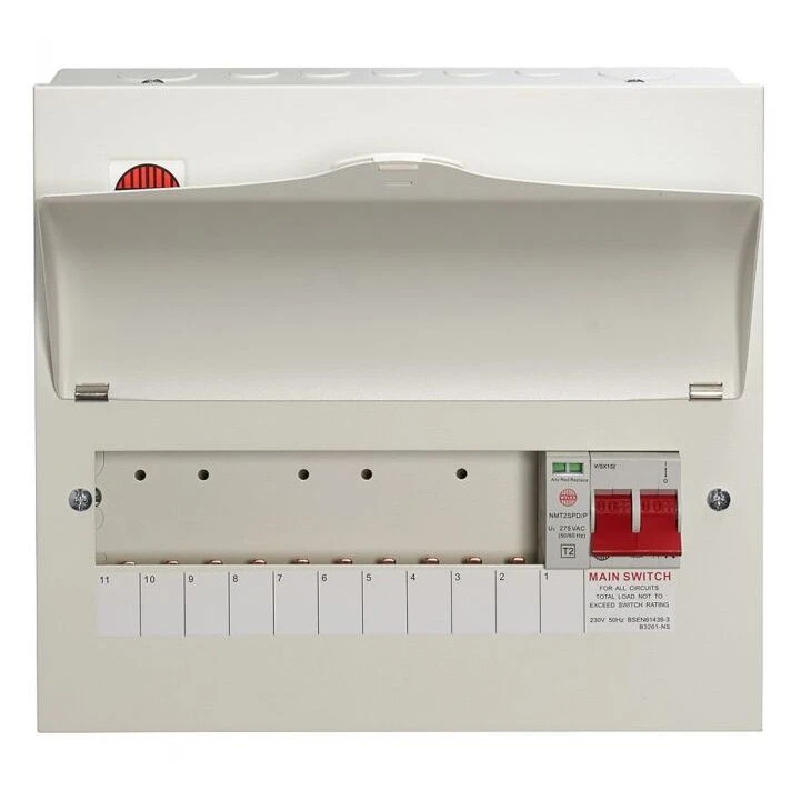· · 10W Main switch plus SPD consumer unit · · Includes a 100A main switch with twin line and neutral supply terminals and a 100A fixed busbar assembly · · Fitted with the Wylex miniature type 2 SPD, NMT2SPD3W/1 · · Accepts all Wylex miniature final circuit protection devices; MCBs, RCBOs and AFDDs · · Constructed from a full metal enclosure with curved visor and temporary locking facility