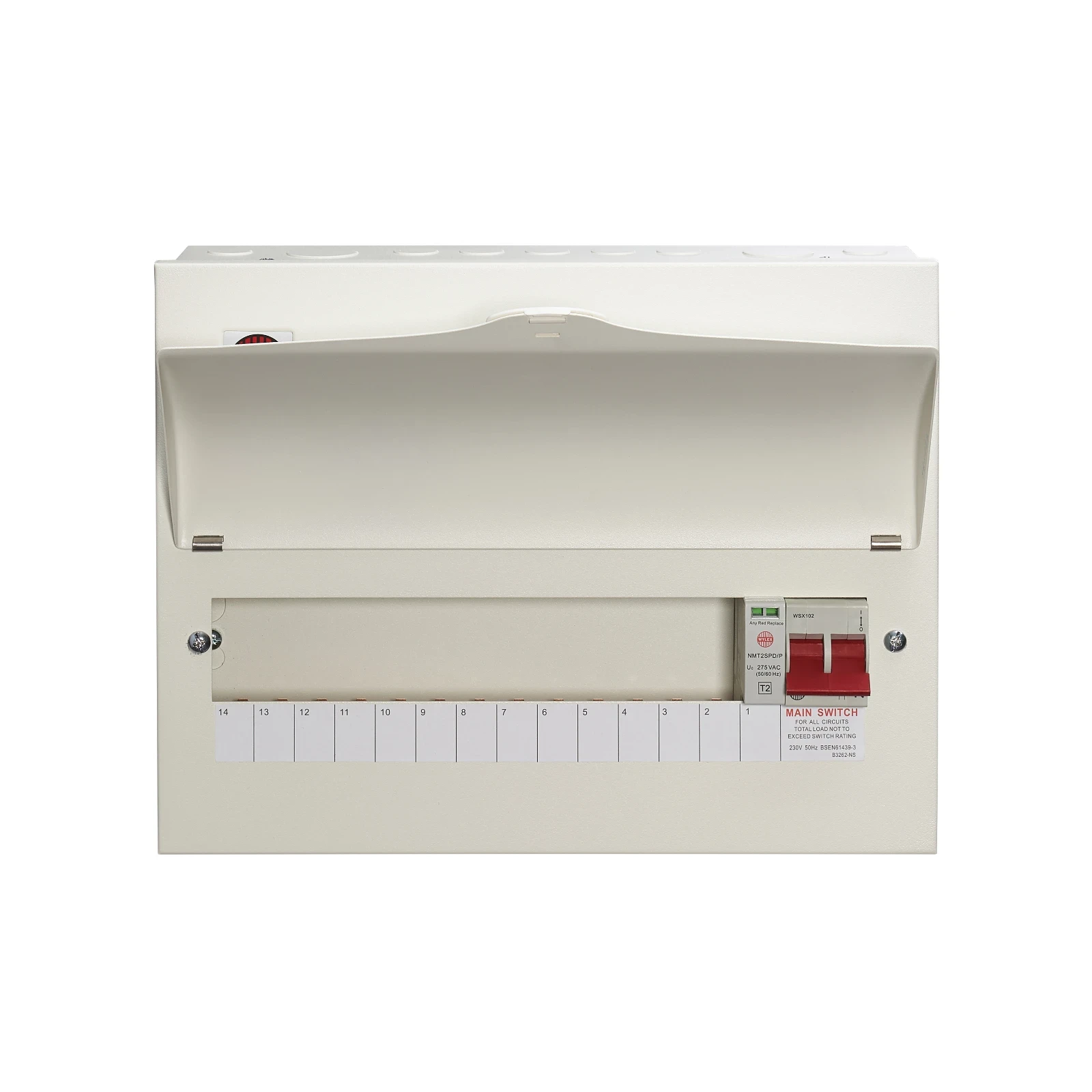 · · 13W Main switch plus SPD consumer unit · · Includes a 100A main switch with twin line and neutral supply terminals and a 100A fixed busbar assembly · · Fitted with the Wylex miniature type 2 SPD, NMT2SPD3W/1 · · Accepts all Wylex miniature final circuit protection devices; MCBs, RCBOs and AFDDs · · Constructed from a full metal enclosure with curved visor and temporary locking facility