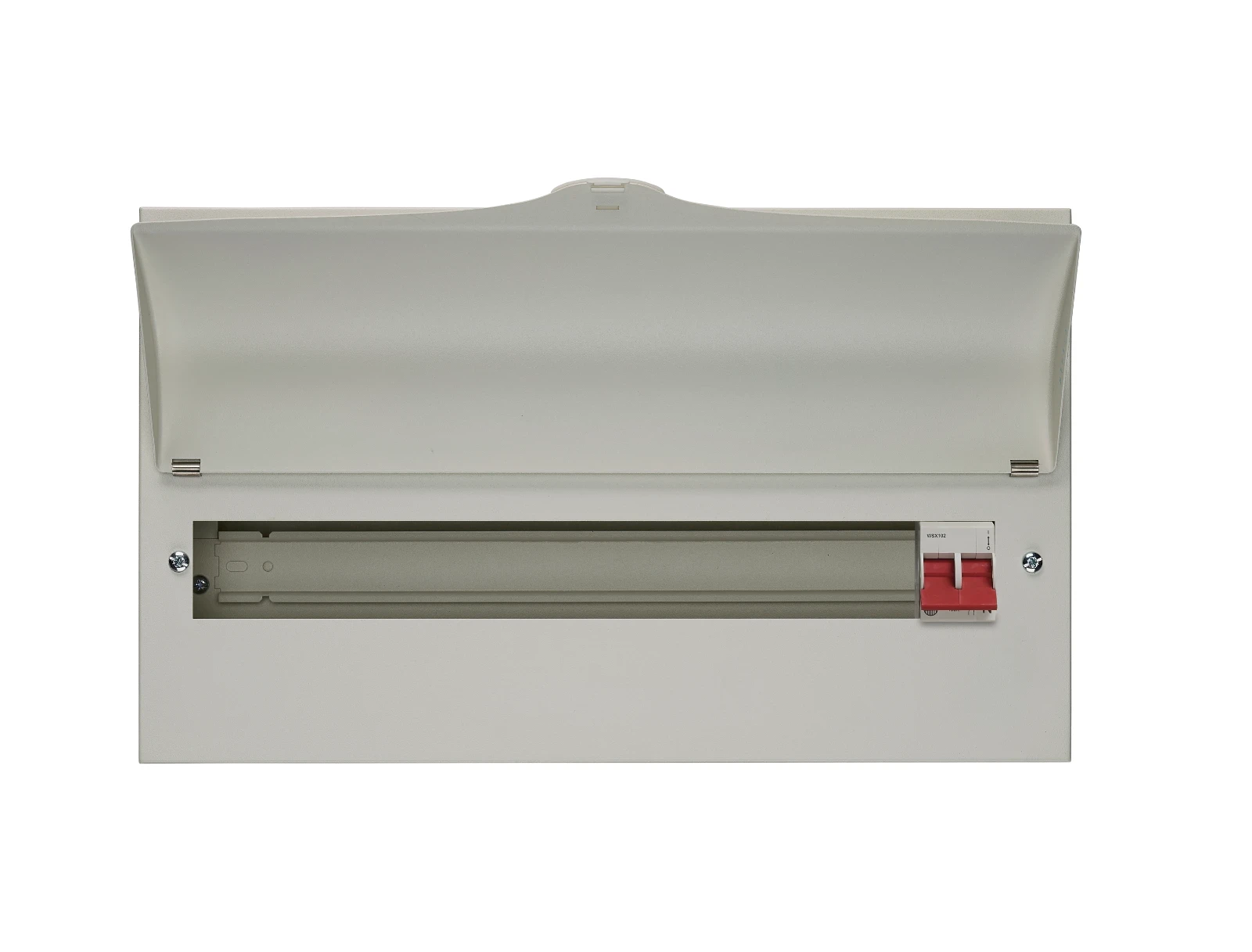 Wylex NM Metal Consumer Unit with 100A main switch, comb bus bar and full DIN-rail. All metal enclosure, no plastic parts. Low smoke and fume painted compact enclosure. Non combustible cover blanks, raised and removable DIN rail/busbar assembly. Cable ent · · · 19W Main switch only consumer unit · · Includes a 100A main switch with twin line and neutral supply terminals and a 100A flexible busbar assembly · · Accepts all Wylex miniature final circuit protection devices; MCBs, RCBOs and AFDDs · · Accepts the Wylex miniature type 2 SPD, NMT2SPD3W/1 · · Metal enclosure includes a full DIN rail with curved visor and temporary locking facility · · c/w 100A Main switch · · Fully compatible with Arc Fault Detection Devices (AFDD) · · Raised & removable DIN rail / busbar assembly · · flexible version