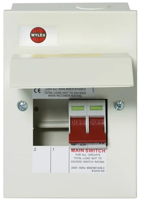 · · 2W Main switch only consumer unit · · Includes a 40A double pole main switch · · Accepts all Wylex miniature final circuit protection devices; MCBs, RCBOs and AFDDs · · Accepts the Wylex miniature type 2 SPD, NMT2SPD3W/1 · · Constructed from a full metal enclosure with angled visor