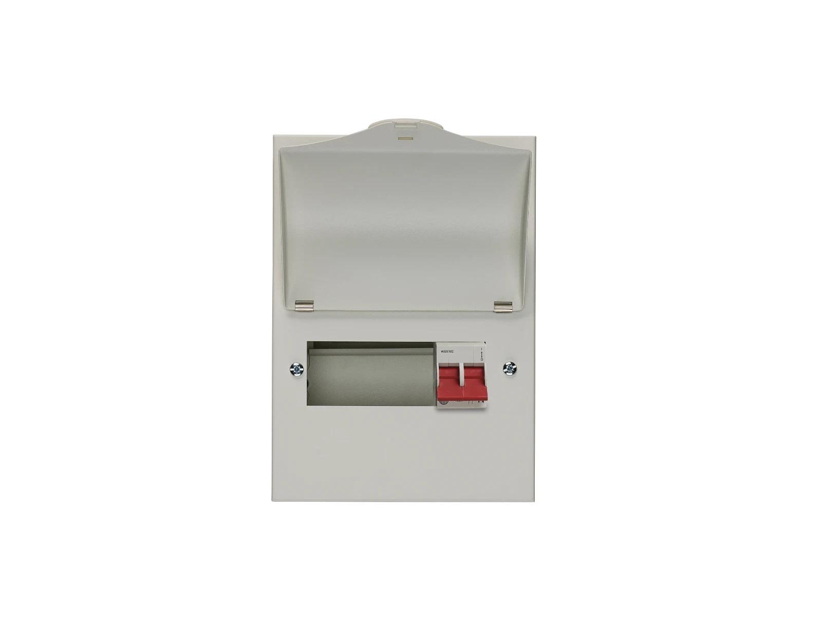 Wylex NM All Metal 5 Way Consumer Unit 100A Main Switch. It comes as compact enclosure with low smoke and fume painted features. This consumer unit comes with raised and removable DIN rail/busbar assembly. · · · 5W Main switch only consumer unit · · Includes a 100A main switch with twin line and neutral supply terminals and a 100A fixed busbar assembly · · Accepts all Wylex miniature final circuit protection devices; MCBs, RCBOs and AFDDs · · Accepts the Wylex miniature type 2 SPD, NMT2SPD3W/1 · · Constructed from a full metal enclosure with curved visor and temporary locking facility · · UKAS certified to BS EN 61439-3 · · Top hinged self closing, stay shut door & metal hinges · · Factory fitted incoming devices for reduced installation time · · Factory fitted incoming devices for reduced installation time