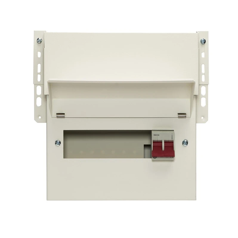 · · 8W Main switch only meter cabinet consumer unit · · Includes a 100A double pole main switch with twin line and neutral supply terminals · · Accepts all Wylex miniature final circuit protection devices; MCBs, RCBOs and AFDDs · · Accepts the Wylex miniature type 2 SPD, NMT2SPD3W/1 · · Constructed from a full metal enclosure with angled visor and is suitable for mounting upon 273mm fixing centres
