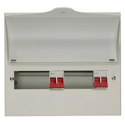 NMIIX5406L Wylex NM All Metal Dual Tariff Consumer Unit 100A Main Switch 4 Way + 100A Main Switch 5 Way. It comes as compact enclosure with low smoke and fume painted features. This consumer unit comes with raised and removable DIN rail/busbar assembly. · · · Full metal enclosure · · Fixed busbar assembly · · 5+4 Dual tariff · · 2x 100A main switch · · Cable entry knockouts on 5 sides, top, bottom, left, right and rear · · UKAS certified to BS EN 61439-3 · · Top hinged self closing, stay shut door & metal hinges · · Factory fitted incoming devices for reduced installation time