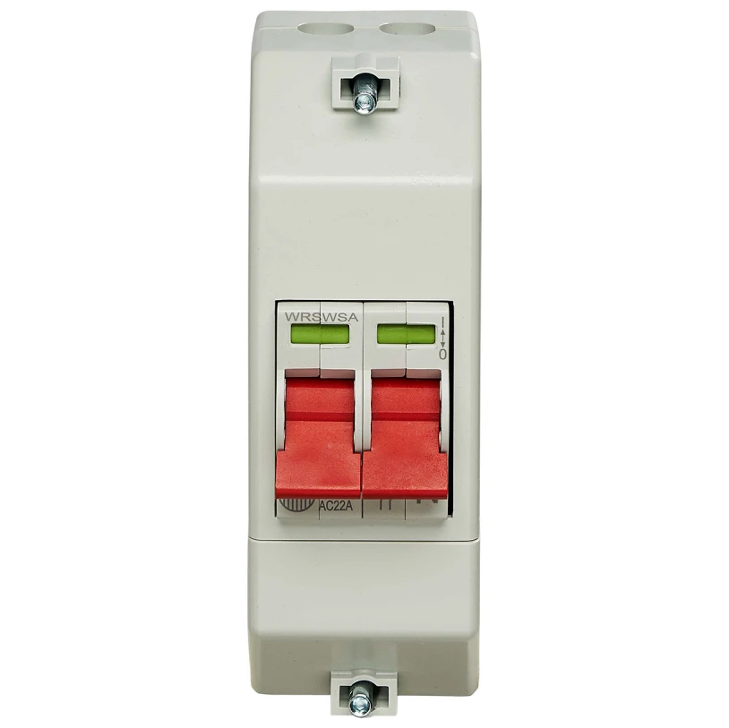 Wylex RECSW2S Switch DP Twin Terminal REC · · · 100A Double pole switch disconnector · · Twin terminal (Pozi 2 cross/slot combi screw heads) · · Slimline 3 part seal and secure enclosure · · Lockable switch handle · · Mounting Type: Surface · · Terminal Type: Combi Screw · · Switched: Y · · Lockable?: N · · Enclosed: Y · · Flexible: N