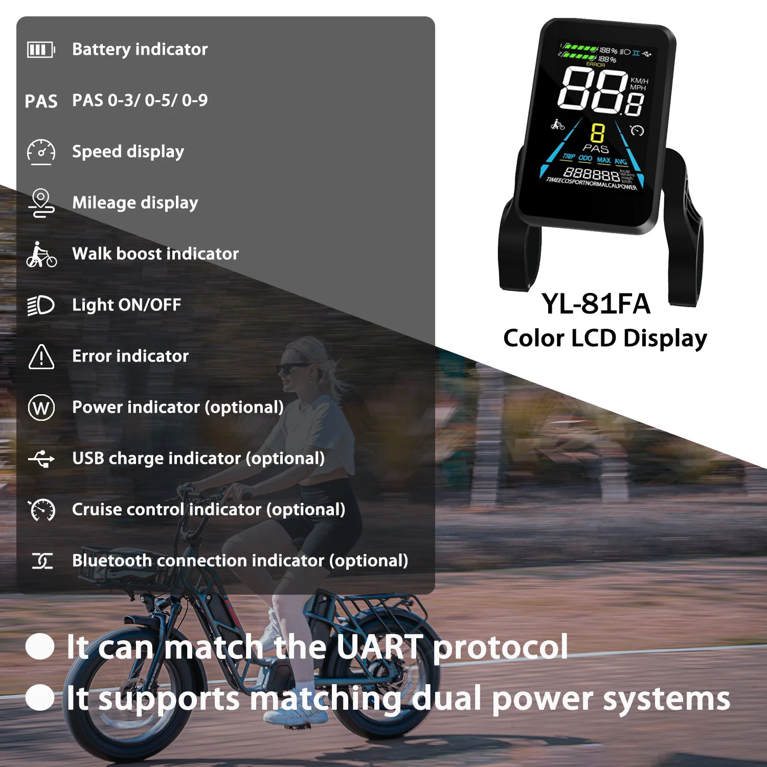 YOLIN YL-81F 24V-72V UART2 Protocol Colorful LCD Screen Display for Electric Bikes Waterproof Plug SM/E-bike Display 72V