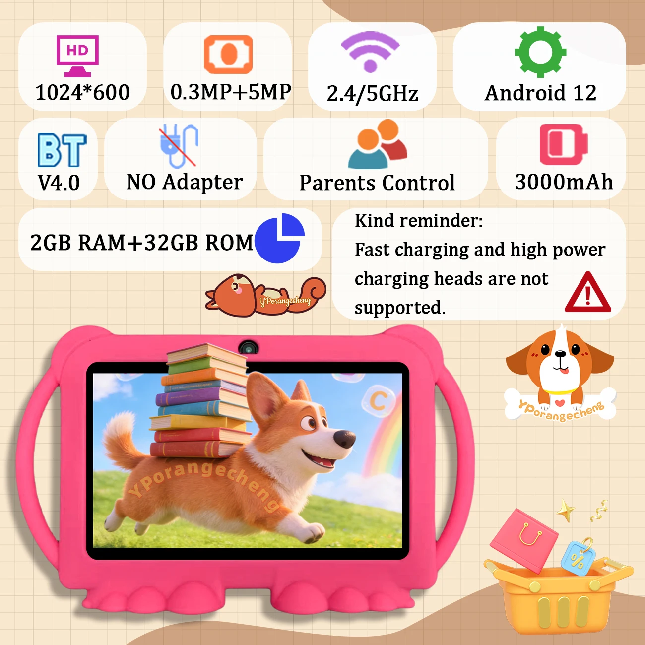 YPORANGECHENG 7 Inch Tablette Pour Enfants 2GB+32GB MTK Quad Core 3000MAH Wi-Fi 5G 1024×600
